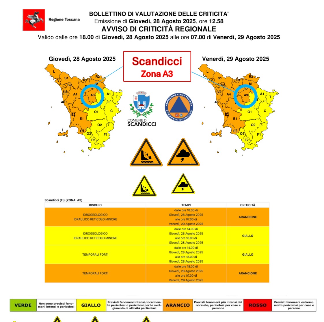 Il Centro funzionale regionale (Cfr) della Regione Toscana ha emesso un’allerta meteo di colore arancione per rischio idrogeologico e temporali forti dalle ore 18.00 di oggi, giovedì 28 agosto, alle ore 7 di domani, venerdì 29 agosto su tutto il territorio regionale, compreso quello di Scandicci, a eccezione del Valdarno Superiore, dove è prevista allerta di colore giallo. Confermata fino alle 18 di oggi l’allerta di colore giallo per gli stessi rischi.