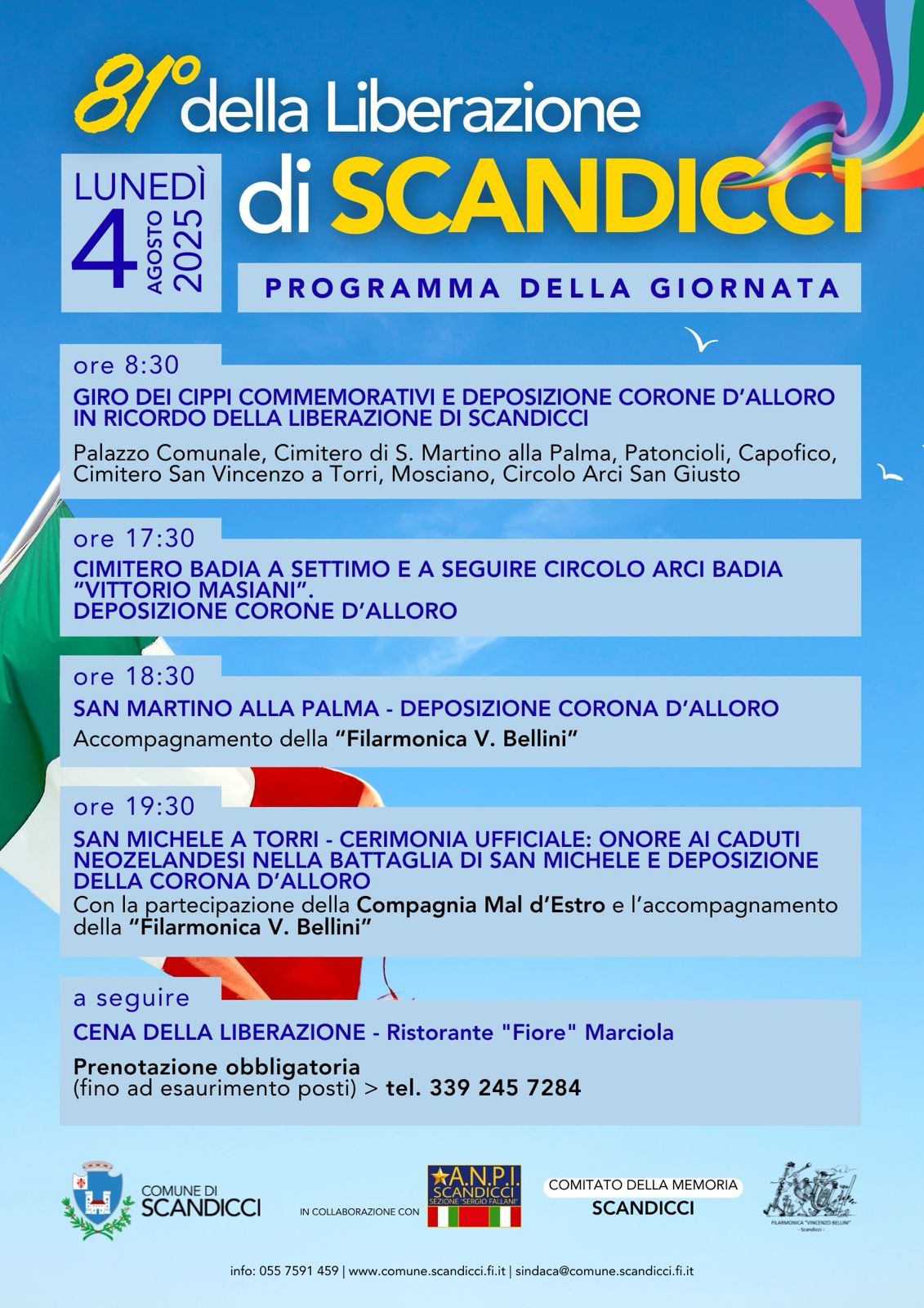 Venerdì 4 agosto 2025 si festeggia l'81esimo anniversario della Liberazione di Scandicci. Per l’occasione la sindaca Claudia Sereni, il presidente del consiglio comunale Gianni Borgi e le associazioni aderenti al Comitato della Memoria di Scandicci invitano alle celebrazioni in programma. Gli eventi sono organizzati dal Comune in collaborazione con Anpi sezione di Scandicci, Comitato della Memoria e Filarmonica Vincenzo Bellini.