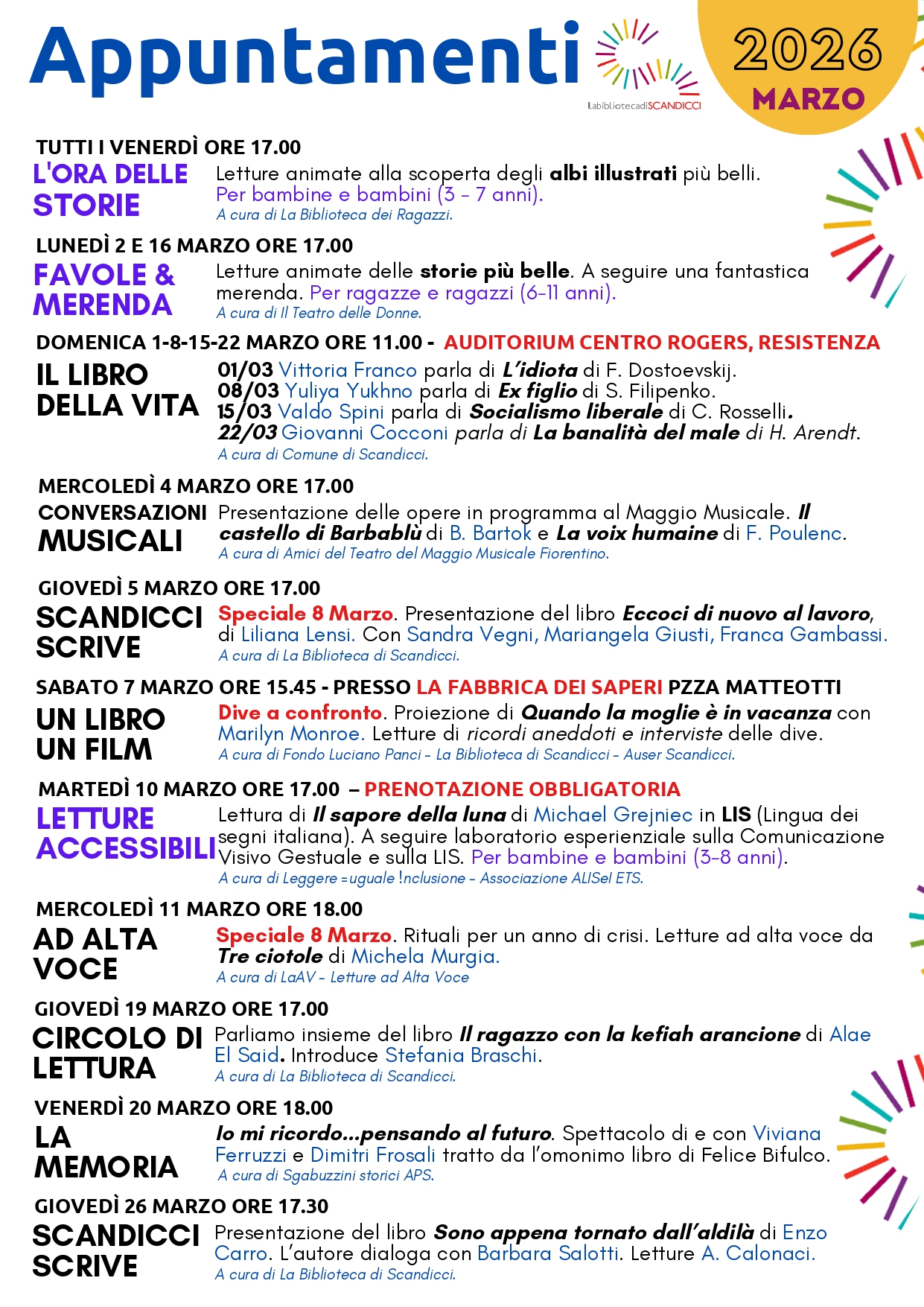 Queste le iniziative in programma per il mese di marzo 2026 alla Biblioteca di Scandicci: