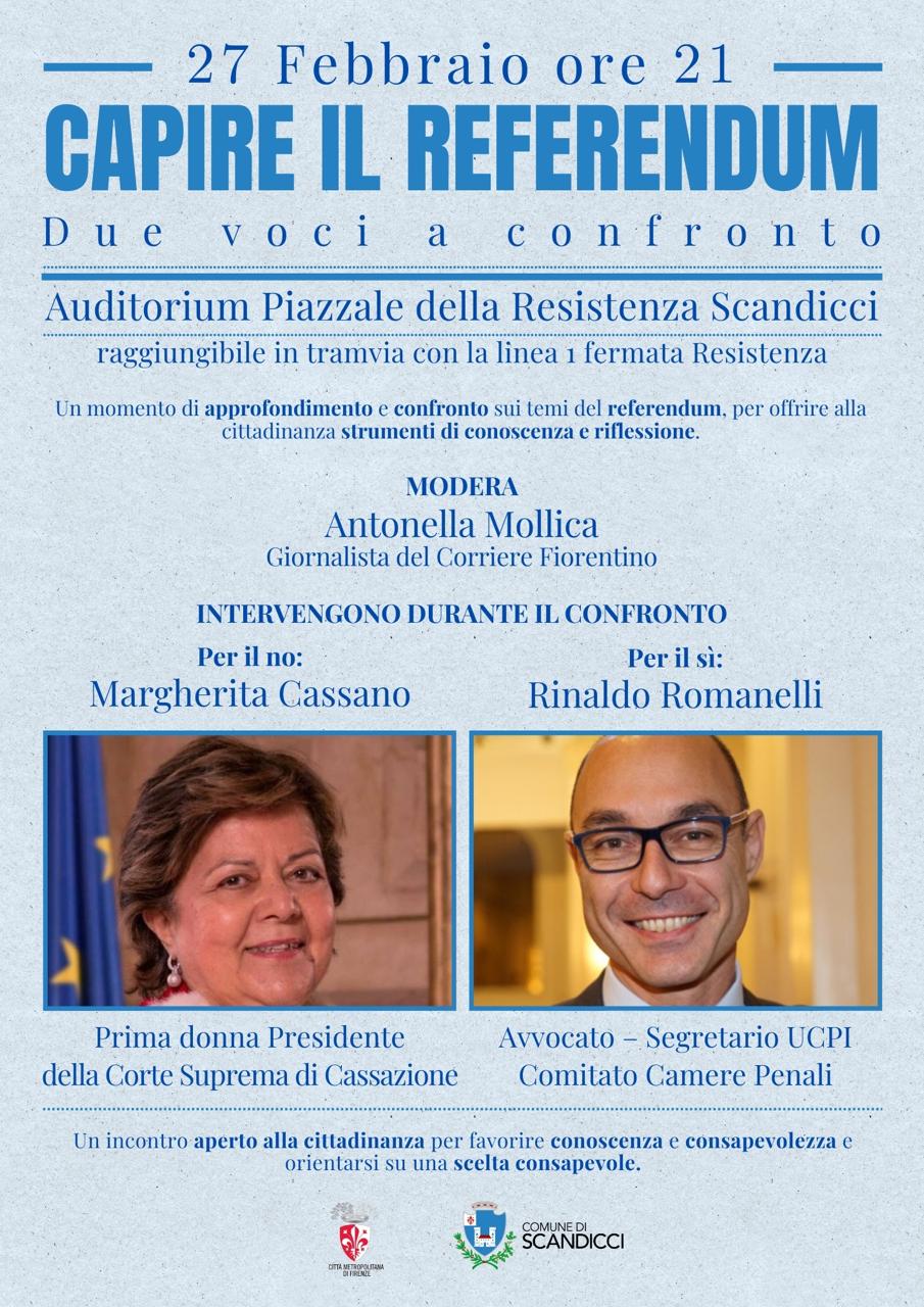 L’evento, dal titolo “Capire il referendum. Due voci a confronto”, è in programma venerdì 27 febbraio alle ore 21 all’Auditorium di piazzale della Resistenza, a Scandicci. Interverranno Margherita Cassano, prima donna presidente della Corte di Cassazione, per le ragioni del “no”, e l’avvocato Rinaldo Romanelli, segretario dell’Unione Camere Penali Italiane, per le ragioni del “sì”.