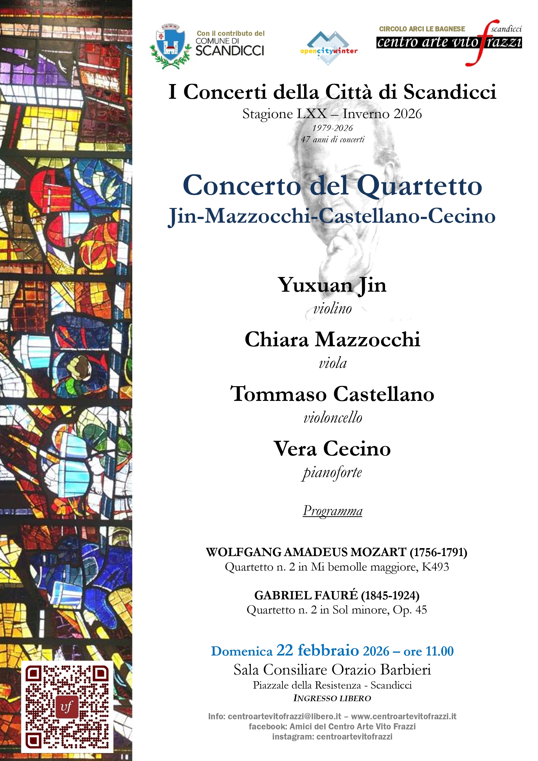 Concerti della Città di Scandicci, domenica 22 febbraio l'esibizione del Quartetto Jin-Mazzocchi-Castellano-Cecino