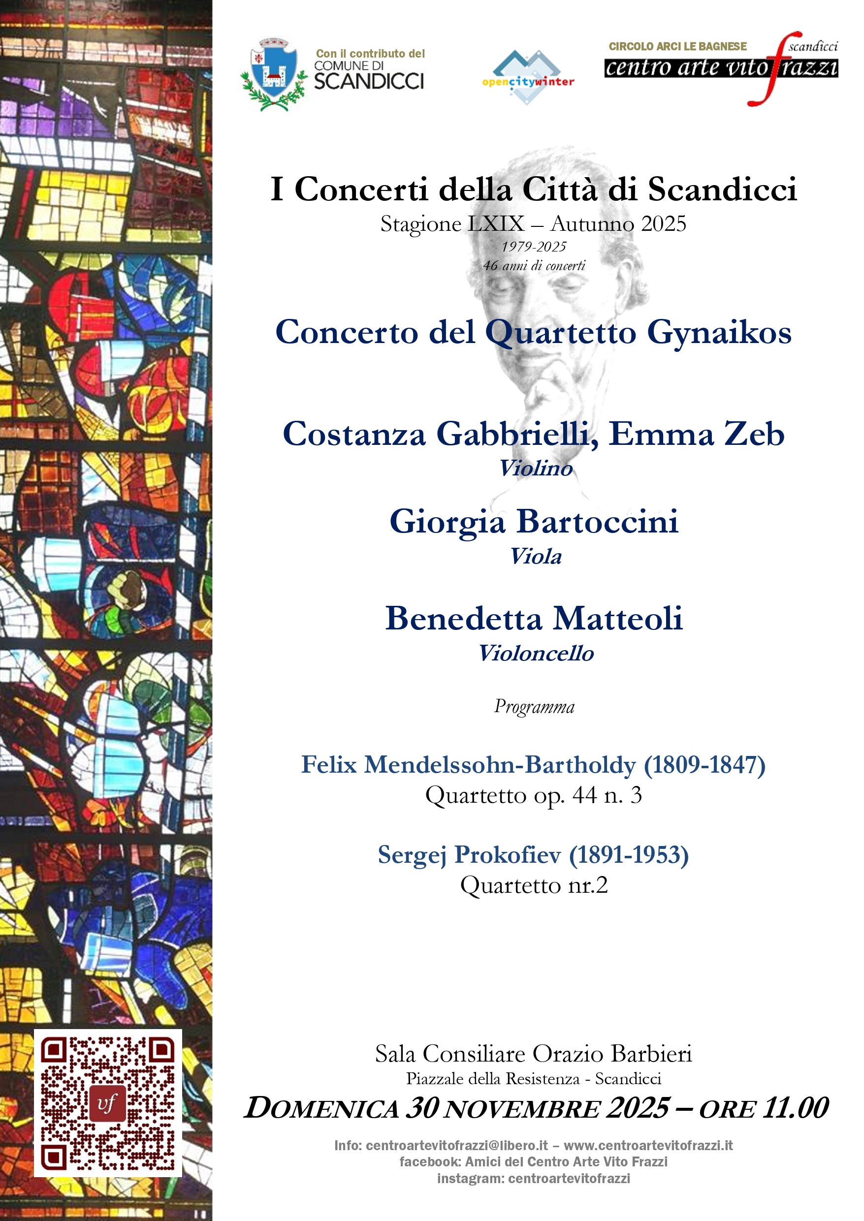Domenica 30 novembre, alle ore 11 presso la sala consiliare Orazio Barbieri, nuovo appuntamento della LXIX stagione dei Concerti della Città di Scandicci, autunno 2025, organizzata dal Centro Arte Vito Frazzi nell'ambito di Open City Winter, con il patrocinio del Comune. A esibirsi sarà il Quartetto Gynaikos: Costanza Gabbrielli, Emma Zebi – violino - Giorgia Bartoccini – viola - Benedetta Matteoli - violoncello. Programma: Felix Mendelssohn-Bartholdy (1809-1847), Quartetto op. 44 n. 3; Sergej Prokofiev (1891-1953), Quartetto n. 2.