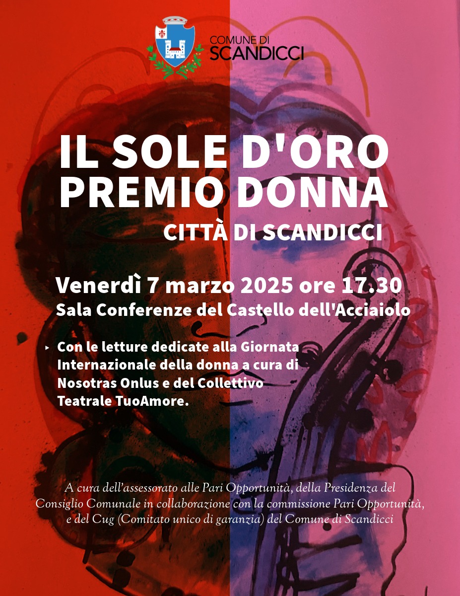 Alle vincitrici verrà consegnata una targa di riconoscimento, sulla quale è raffigurata una riproduzione del bozzetto originale della statua Il Sole, dello scultore Fuad Aziz. L'opera è stata realizzata all’inizio degli anni ’90 dall’artista - nato ad Arbil nel Kurdistan Iracheno nel 1951 - ed installata nell’area attorno al palazzo comunale di Scandicci, come benvenuto per chi arriva nel centro cittadino. Oltre alla premiazione ci saranno letture dedicate alla Giornata Internazionale della donna a cura di Nos Otras e del Collettivo Teatrale TuoAmore. La serata è a cura dell'assessorato alla Pari Opportunità, della presidenza del consiglio comunale, in collaborazione con la Commissione Pari Opportunità e con il Comitato unico di garanzia del Comune di Scandicci".
