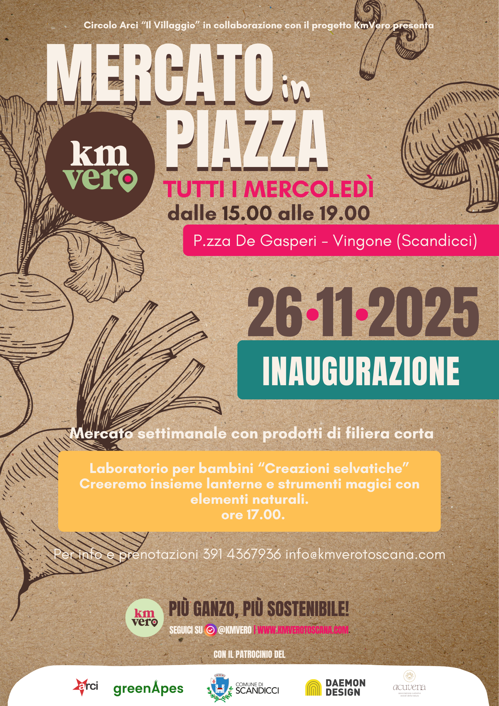 Mercoledì 26 novembre, in piazza De Gasperi a Vingone, il Circolo Arci “Il Villaggio” inaugura, in collaborazione con il progetto KM Vero, il nuovo mercato sperimentale di filiera corta "KM Vero – Mercato in Piazza", con il patrocinio del Comune di Scandicci. L’iniziativa, che si terrà tutti i mercoledì dalle 15 alle 19, nasce per promuovere un modello di consumo sostenibile e di prossimità, creando un punto di incontro tra cittadini e produttori locali, dove riscoprire il valore della filiera corta, delle tradizioni contadine e del vivere sostenibile.
