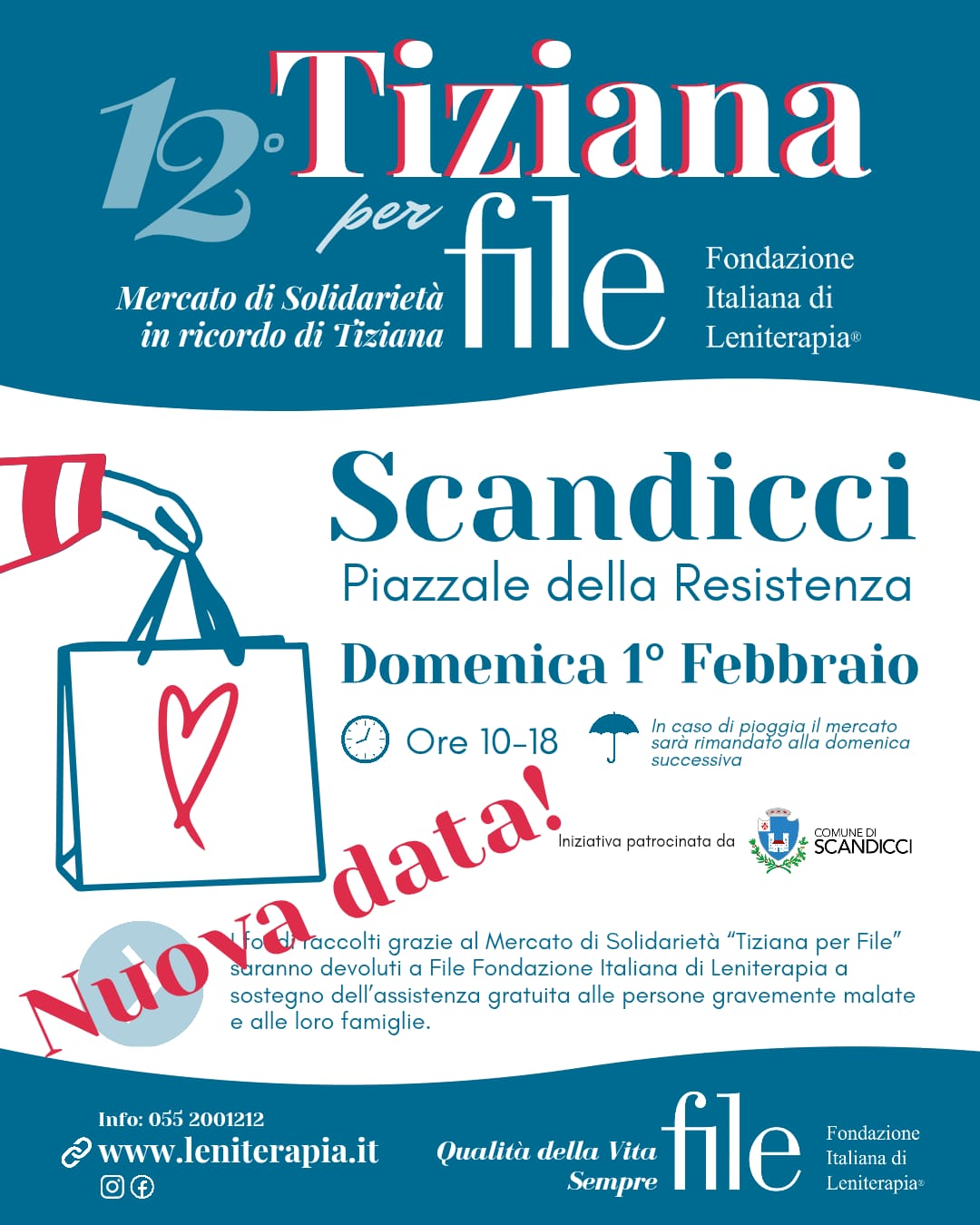 Spostata a domenica 1 febbraio 2026, causa maltempo, la dodicesima edizione di "Tiziana per File". Un mercato per ricordare la generosità di Tiziana e trasformare il ricordo di amici e parenti in un gesto concreto di solidarietà: organizzato dal marito Salvo Procida e da un gruppo di amici e sostenitori in memoria della donna, punto di riferimento per la comunità locale, scomparsa alcuni anni fa per una malattia. L'iniziativa sostiene l’attività della Fondazione Italiana di Leniterapia (File) a favore delle persone gravemente malate e delle loro famiglie. L'appuntamento, patrocinato dal Comune di Scandicci, si svolgerà dalle ore 10 alle 18 in piazzale della Resistenza a Scandicci.