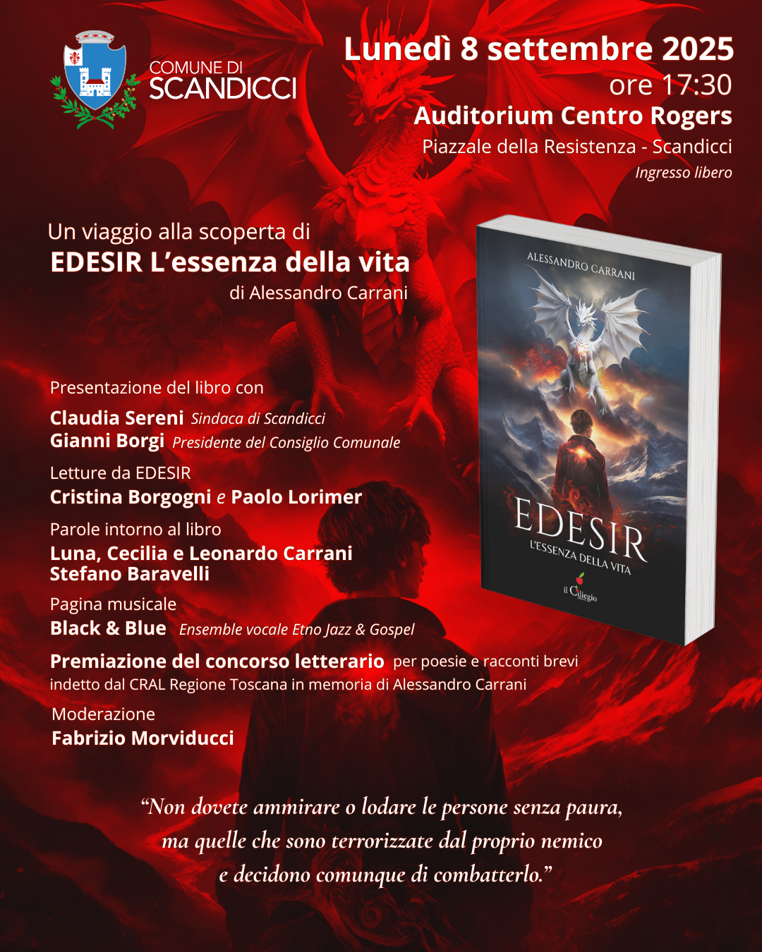 La presentazione del libro “Edesir L’essenza della vita” di Alessandro Carrani (Edizioni Il Ciliegio) si terrà lunedì 8 settembre alle ore 17,30 nell'Auditorium di piazzale della Resistenza a Scandicci.