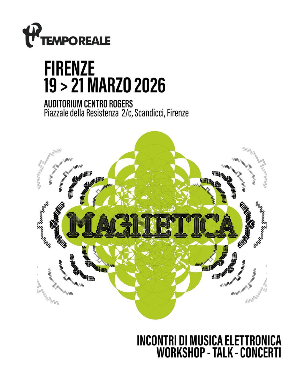 Magnetica è un progetto di Tempo Reale. Con il patrocinio di Comune di Scandicci, AIMI-Associazione Informatica Musicale Italiana, in collaborazione con ISIA Firenze. | Comitato artistico-scientifico: Agnese Banti, Francesco Canavese, Simone Faraci, Francesco Giomi, Andrea Gozzi, Giovanni Magaglio, Damiano Meacci, Franz Rosati, Luisa Santacesaria, Francesco Vogli. | MAGNETICA fa parte di Scuola di Suono, ecosistema culturale multiforme per l’educazione al suono, alla ricerca e alla diffusione musicale, sostenuto da Fondazione Cassa di Risparmio di Firenze. | Identità visiva a cura del Biennio specialistico in Design della comunicazione e del prodotto digitale di ISIA Firenze.