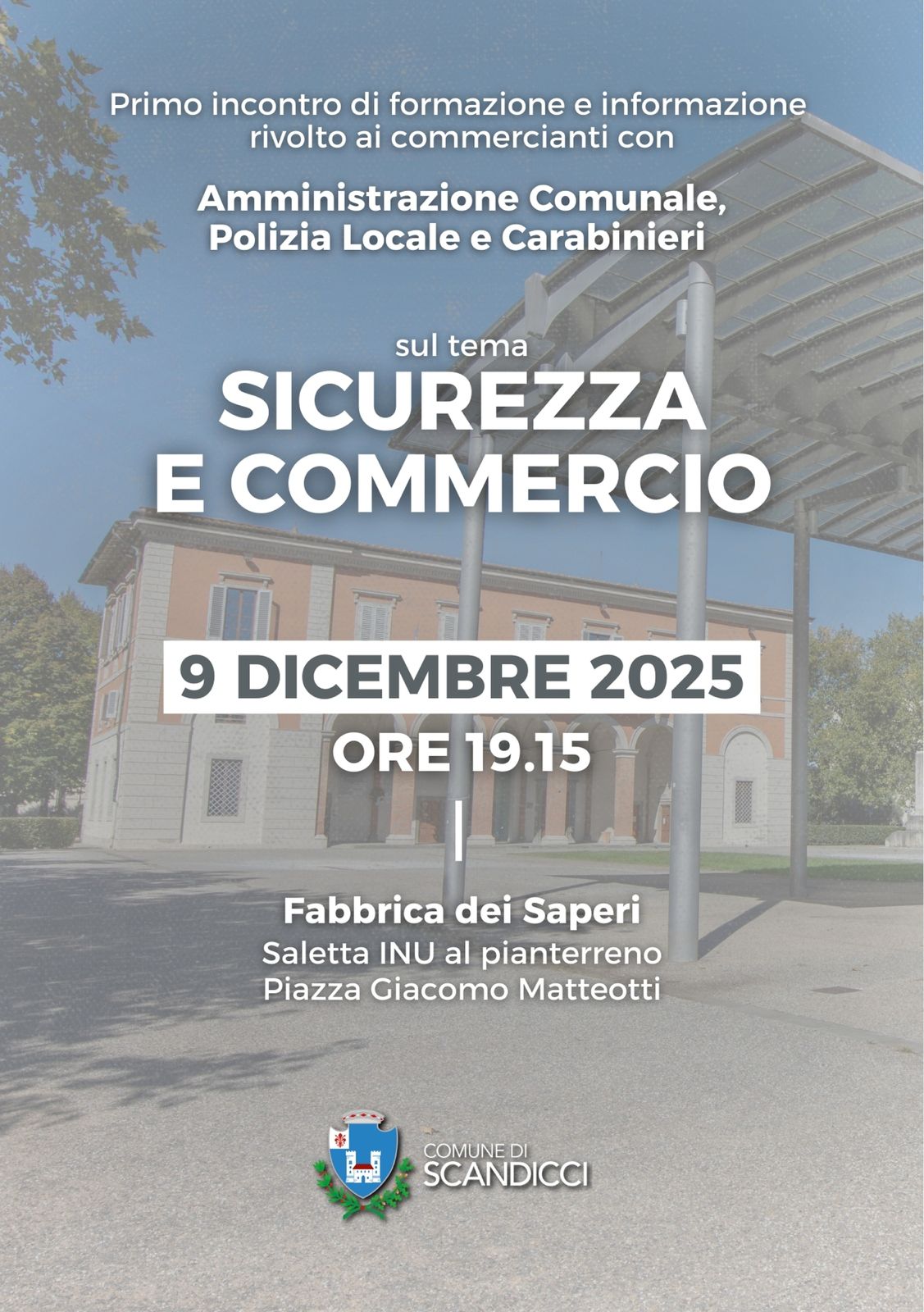 Si terrà martedì 9 dicembre alle 19,15, presso la saletta Inu al piano terra della Fabbrica dei Saperi in piazza Matteotti, il primo incontro informativo e formativo sui temi della sicurezza e della prevenzione, rivolto ai commercianti di Scandicci. All'appuntamento saranno presenti Amministrazione comunale, Polizia Locale e Arma dei Carabinieri.