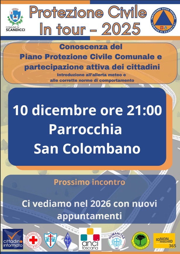 Si terrà mercoledì 10 dicembre alle 21, presso i locali della parrocchia di San Colombano, l'ultimo degli incontri in programma per il 2025 di "Protezione civile in tour", il ciclo di appuntamenti rivolti alla cittadinanza e tenuti dall'ufficio Protezione civile del Comune insieme ai volontari, con lo scopo di illustrare il piano di protezione civile.