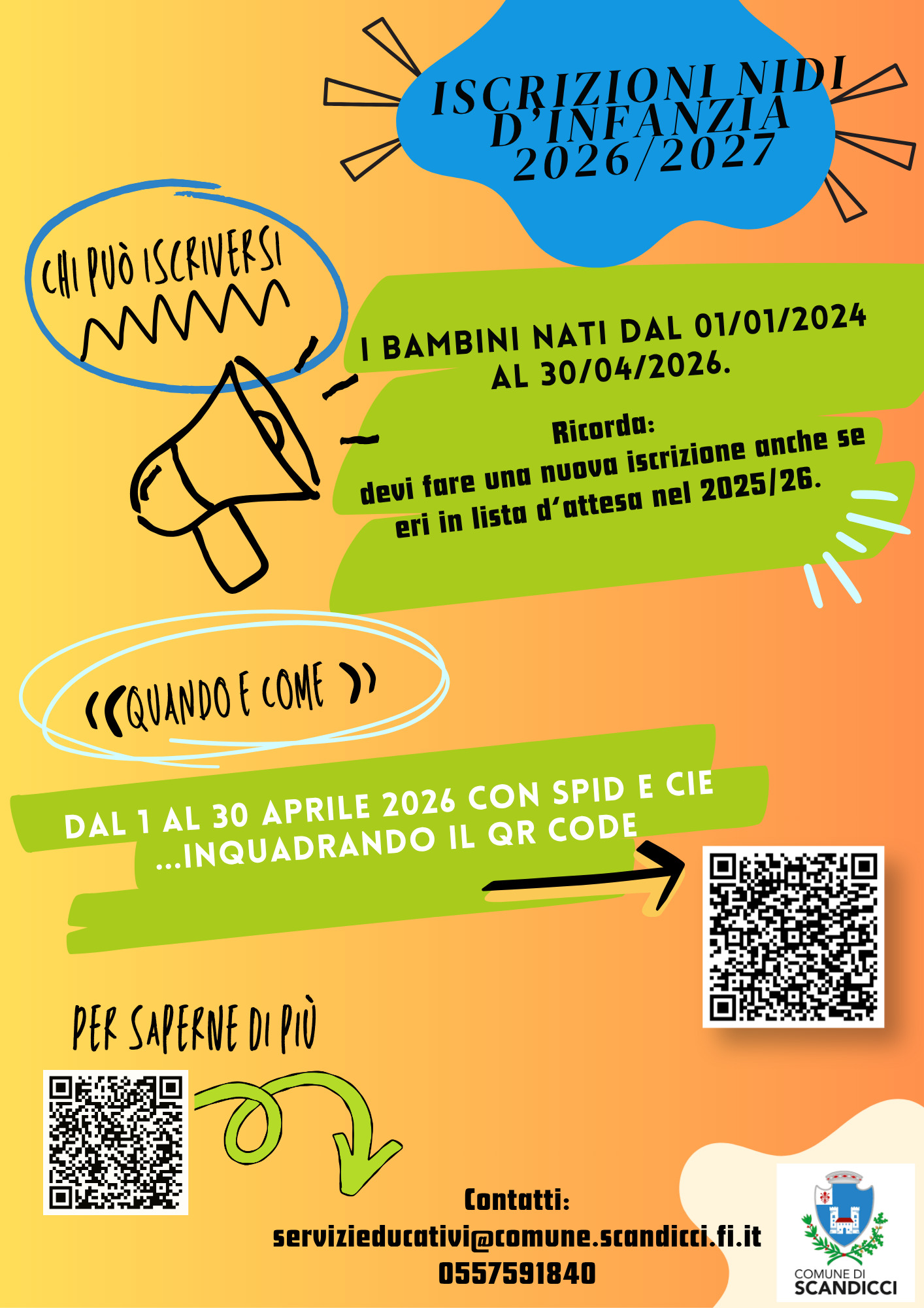 Aperte da mercoledì 1 aprile, fino a giovedì 30, le iscrizioni ai nidi d'infanzia per l'anno educativo 2026-2027. La domanda di iscrizione dovrà essere presentata da un genitore o da un tutore, esclusivamente online, tramite il portale https://www.comune.scandicci.fi.it/servizi/educazione-e-formazione/iscrizione-ai-nidi-di-infanzia-comunali-0-3-anni. Per accedere al servizio sono necessari Spid o Cie.