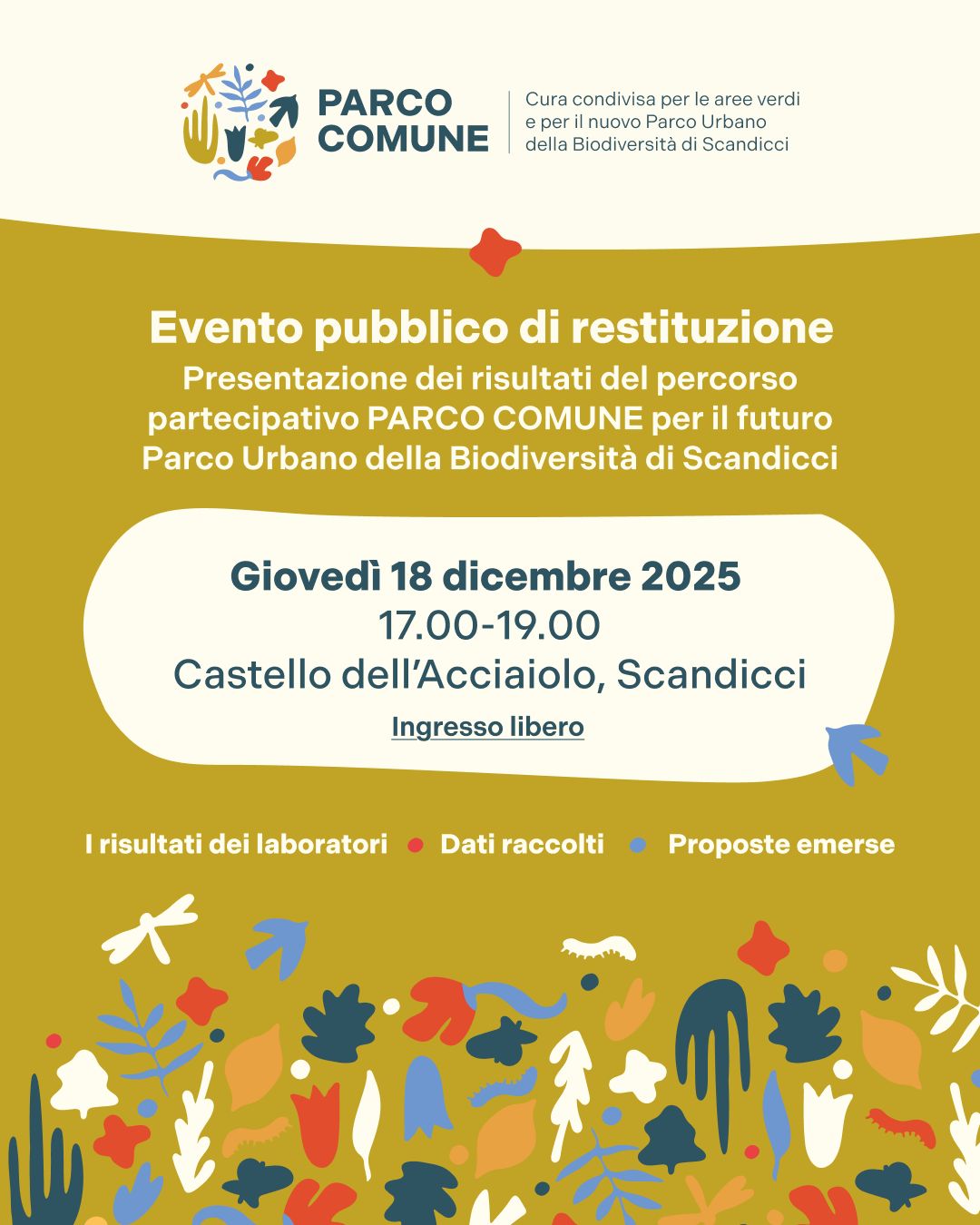 Scandicci presenta i principali risultati del percorso partecipativo Parco Comune, per il futuro Parco Urbano della Biodiversità, promosso dal Comune con il sostegno dell’Autorità Regionale per la Partecipazione – Regione Toscana e il supporto metodologico di Sociolab. Appuntamento giovedì 18 dicembre 2025, dalle 17 alle 19, al Castello dell’Acciaiolo.