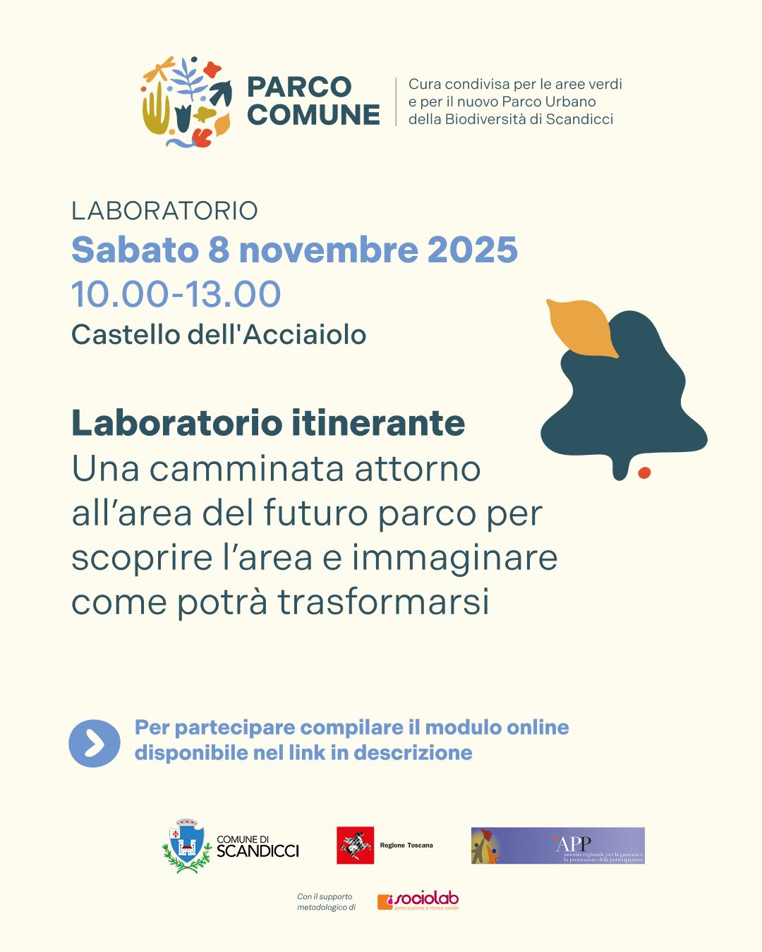 Previsto per sabato 8 novembre il primo dei laboratori programmati nell'ambito di Parco Comune, il percorso di partecipazione, promosso dal Comune di Scandicci con il sostegno dell'Autorità Regionale per la Partecipazione, che accompagna la realizzazione del Parco Urbano della Biodiversità, il progetto di trasformazione e valorizzazione di circa 12 ettari tra il Castello dell’Acciaiolo e l’ex-CNR. L'appuntamento è dalle 10 alle 13 al Castello dell'Acciaiolo, per una camminata attorno all'area del futuro parco al fine di immaginare come potrà trasformarsi. La partecipazione è gratuita. Per iscriversi è necessario compilare il modulo al seguente link.