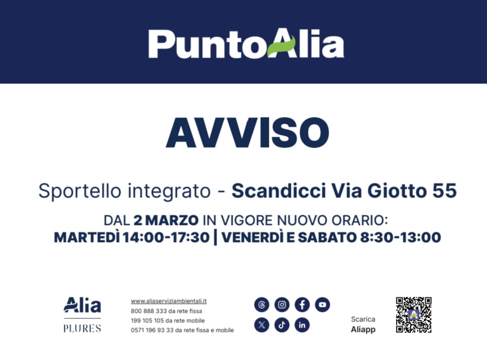 A partire dal 2 marzo entrano in vigore importanti aggiornamenti sugli sportelli al pubblico di Plures Alia, con novità che riguardano sedi, giorni e orari di apertura in diversi comuni dell’Ato Toscana Centro. Un intervento mirato a rendere i servizi ancora più accessibili e rispondere in modo puntuale alle esigenze dei cittadini. Presso gli sportelli Plures Alia i cittadini possono ricevere assistenza per tutte le pratiche legate alla tariffa — attivazioni, variazioni, cessazioni e chiarimenti sugli avvisi di pagamento — oltre a informazioni sui servizi di raccolta rifiuti, sul corretto conferimento dei materiali e sul ritiro delle attrezzature. Gli operatori garantiscono supporto personalizzato sia alle utenze domestiche sia alle attività economiche, offrendo un punto di riferimento diretto e qualificato sul territorio.