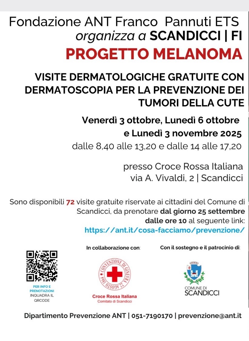 Per accedere alle visite di Progetto Melanoma è obbligatoria la prenotazione online, dal 25 settembre, a partire dalle ore 10,00. Le visite sono riservate ai cittadini/e di Scandicci. Per registrarsi e prenotarsi occorre andare al link https://ant.it/cosa-facciamo/prevenzione/registrazione-visite/