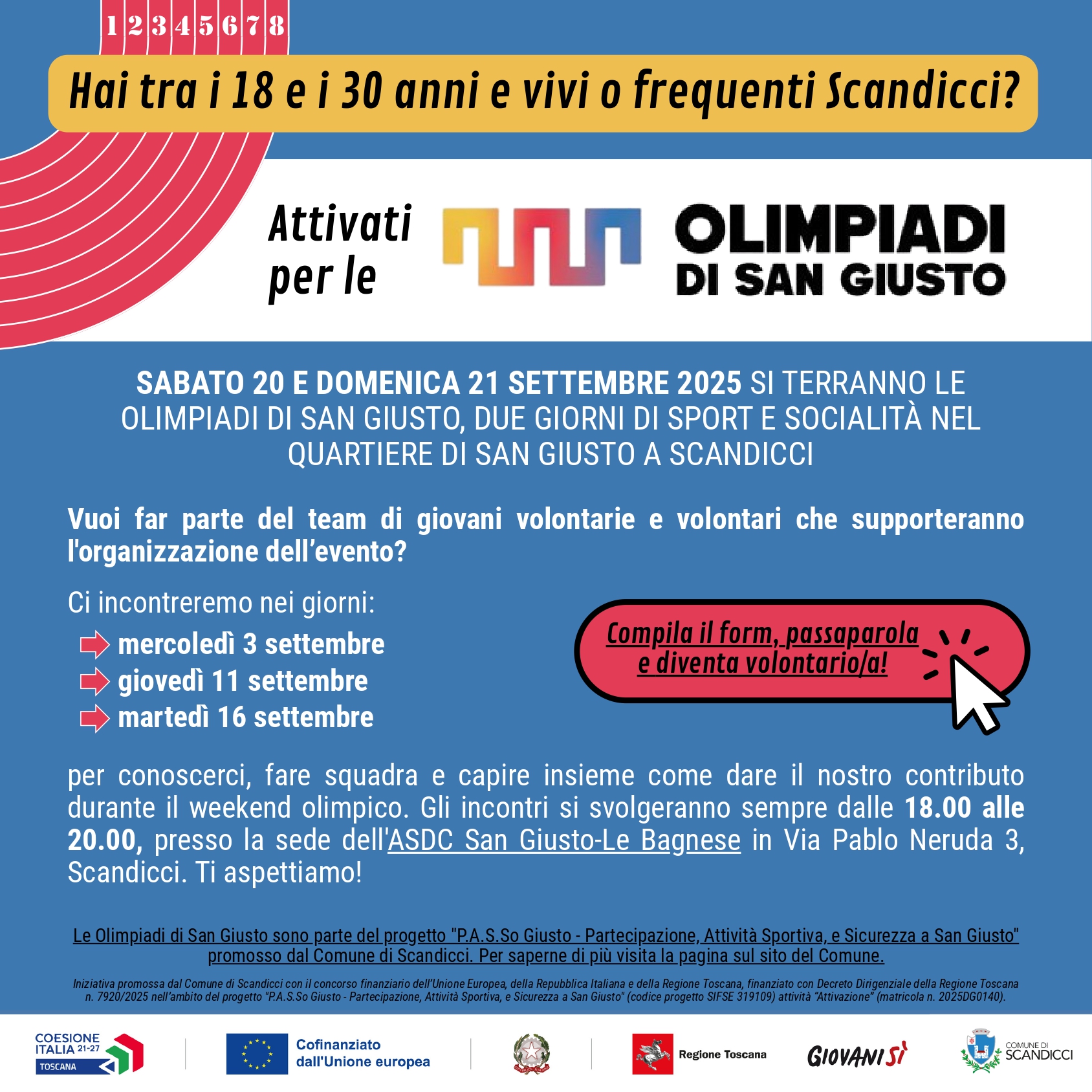 Sabato 20 e domenica 21 settembre 2025 arrivano a Scandicci le Olimpiadi di San Giusto, due giorni di attività sportive e aggregative che animeranno l’intero quartiere e che sono parte del progetto P.A.S.S.o Giusto Partecipazione, Attività Sportiva, e Sicurezza a San Giusto promosso dal Comune di Scandicci e cofinanziato dalla Regione Toscana. Il progetto ha tra i suoi obiettivi principali la promozione della sicurezza urbana attraverso la valorizzazione dello sport come strumento di inclusione, socialità e partecipazione civica. Gare sportive, musica, dialoghi e fotografie d’antan si intrecceranno per creare appartenenza, energie nuove e occasioni di incontro.