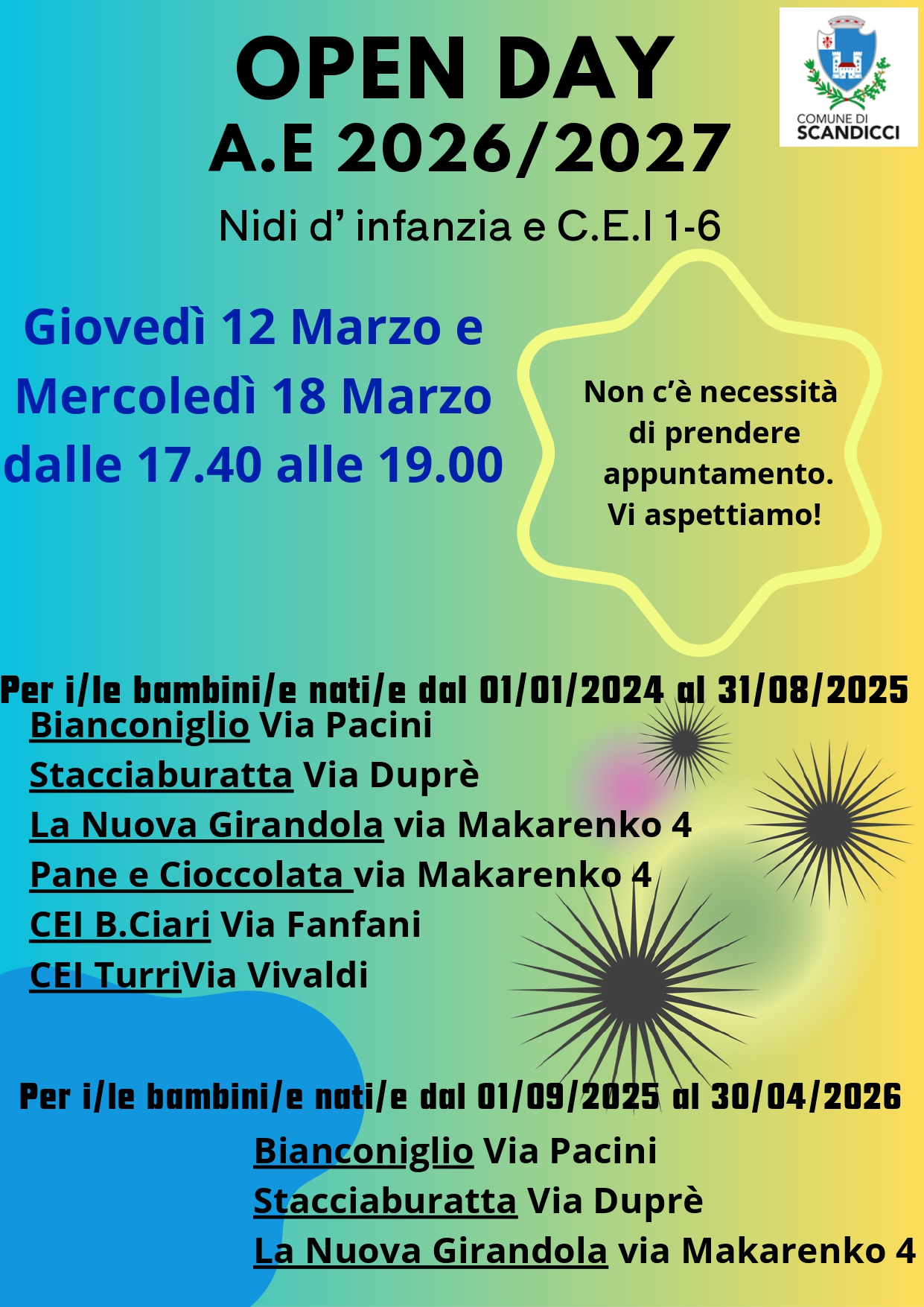Fissati gli open day per presentare alle famiglie i servizi educativi comunali per la prima infanzia. Chi è interessato potrà visitare le strutture nelle giornate di giovedì 12 e di mercoledì 18 marzo, dalle 17,40 alle 19. Non è necessaria la prenotazione.