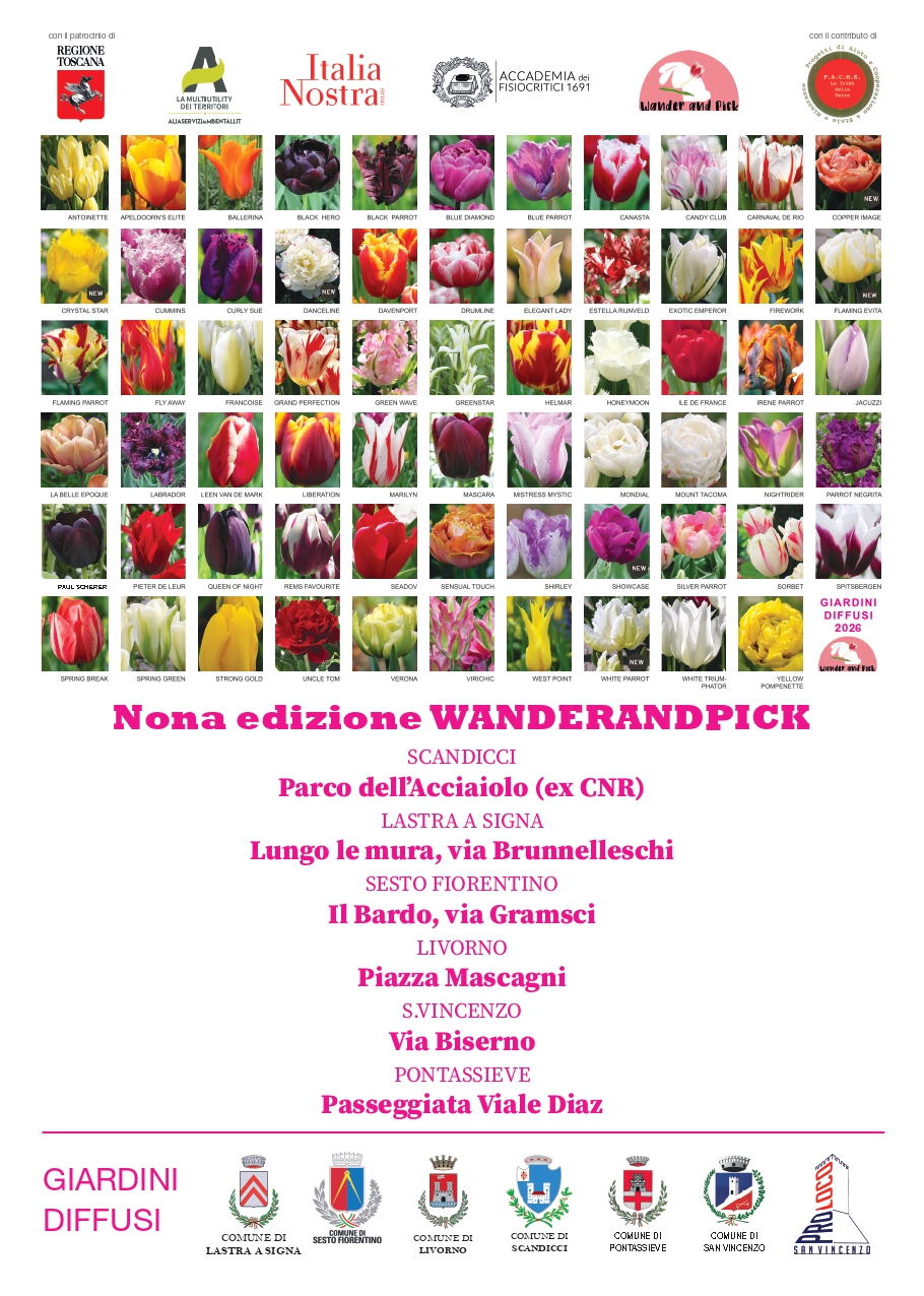 Al via lunedì 16 marzo la nona edizione di Wander and Pick, l'iniziativa nata da un'idea di Alessandra Benati ed entrata a far parte della tradizione di Scandicci. L'appuntamento per il taglio del nastro, alla presenza della sindaca Claudia Sereni, è previsto per le 10 presso il temporary park creato nell'area dell'ex Cnr. Il parco floreale con sperimentazione biologica, che quest'anno avrà la forma di un grande cuore, sarà aperto tutti i giorni dalle 10 alle 19. Domani, domenica 15 marzo, è prevista una pre-apertura al pubblico, con orario 10,30-19.
